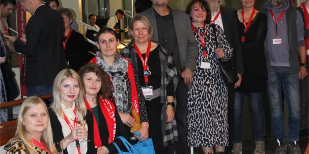 Doch nicht nur die Bühne war anlässlich der Preisverleihung stimmungsvoll erleuchtet, ins rechte Licht gerückt wurden auch die animierten Filmplakate und atmosphärischen Fotografien, die der Bildungsgang der Gestaltungstechnischen Assistentinnen und Assistenten zu Werken des Autors angefertigt hatte. Für die Animationen standen ein überdimensionierter Bildschirm und zahlreiche kleinere sowie zwei lange Stoffbahnen als Beamer-Projektionsflächen zur Verfügung, während die morbiden Fotoserien – von Spots beleuchtet – auf Staffeleien präsentiert wurden.