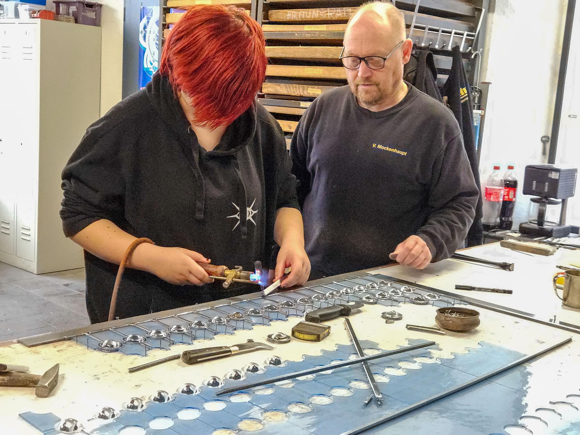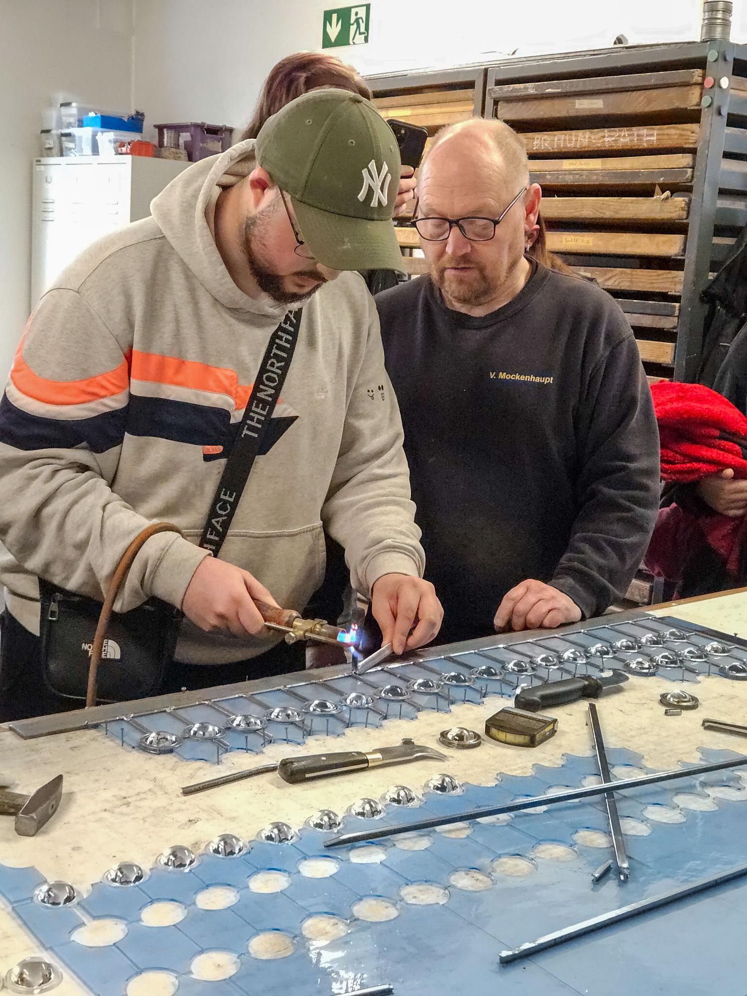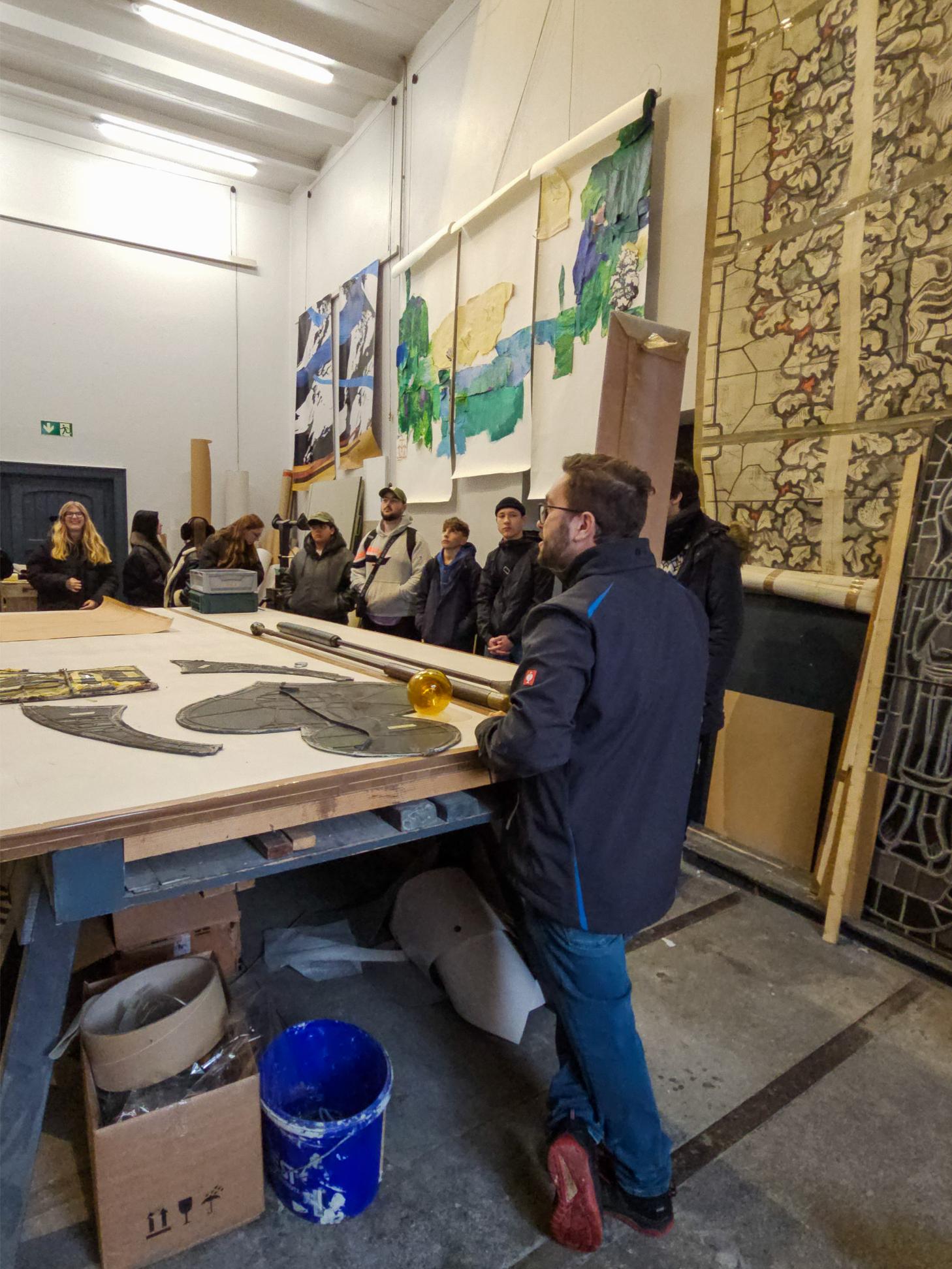 In ihrer dreijährigen Ausbildung an der Rheinbacher Glasfachschule lernen die Auszubildenden, Glas zu bearbeiten – sei es als Glasmalerin, als Glasgraveur, Glaserin oder Glasschleifer. Betriebsleiter Pick ist selbst ein Absolvent der Rheinbacher Schule und konnte bei der Führung daher bestens den Bezug zwischen Ausbildung und Firmenalltag herstellen.