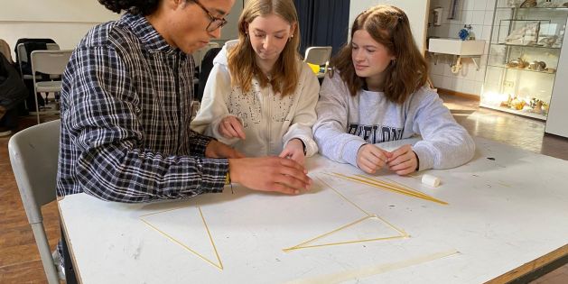 In einem darauffolgenden Workshop sollten wir in Dreiergruppen den höchstmöglichen Spaghetti-Turm mit Marshmallow-Spitze bauen. Dafür standen uns 20 Spaghetti, Kreppband und ein Marshmallow zur Verfügung. Die Gruppe von Annika, Katharina und Laura schaffte mit 68 cm in der vorgegebenen Zeit den höchsten Turm. Anschließend wurde unsere Klasse von der Akademie zum Pizzaessen eingeladen, währenddessen quatschten wir ausgiebig miteinander. Im zweiten Workshop sollte jeder einen eigenen Stuhl entwerfen und schließlich auch kreieren, von Ton bis Styropor standen viele Materialien zur Verfügung. Die fertigen Ergebnisse präsentierten wir vor der Klasse und gewannen so einen Einblick in die Köpfe unserer Mitschüler. Zu guter Letzt erhielten wir einen weiteren Vortrag, diesmal von Herrn Deister, einem Absolventen der Akademie. Dieser erläuterte uns ausführlich den genauen Inhalt des Studiums und erzählte von den Möglichkeiten, die sich danach bieten. Der Besuch war sehr interessant und zeigte, wie Handwerk und Kreativität miteinander verbunden werden können. Wir verabschiedeten und bedankten uns für den schönen Tag und um 15 Uhr begann die Rückfahrt zur Schule.