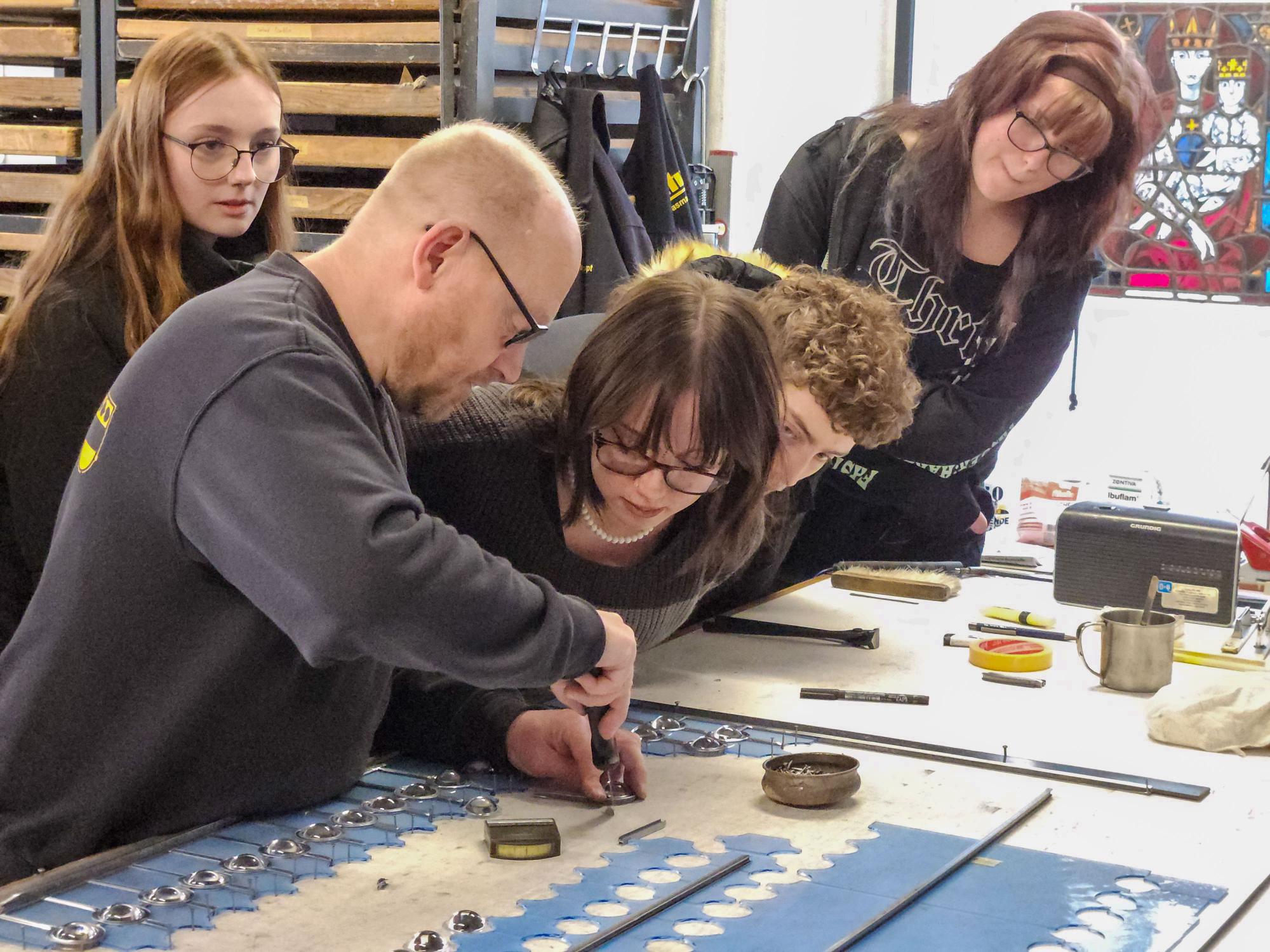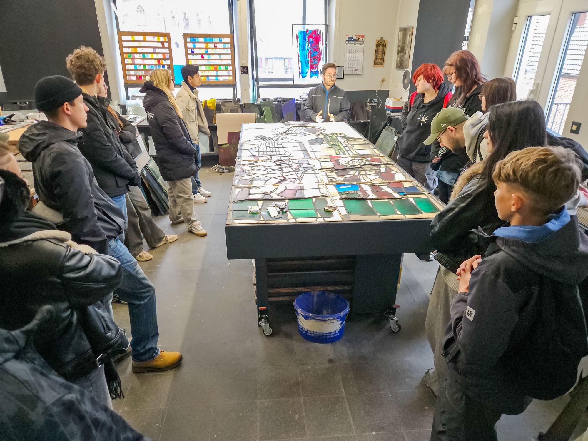 In ihrer dreijährigen Ausbildung an der Rheinbacher Glasfachschule lernen die Auszubildenden, Glas zu bearbeiten – sei es als Glasmalerin, als Glasgraveur, Glaserin oder Glasschleifer. Betriebsleiter Pick ist selbst ein Absolvent der Rheinbacher Schule und konnte bei der Führung daher bestens den Bezug zwischen Ausbildung und Firmenalltag herstellen.